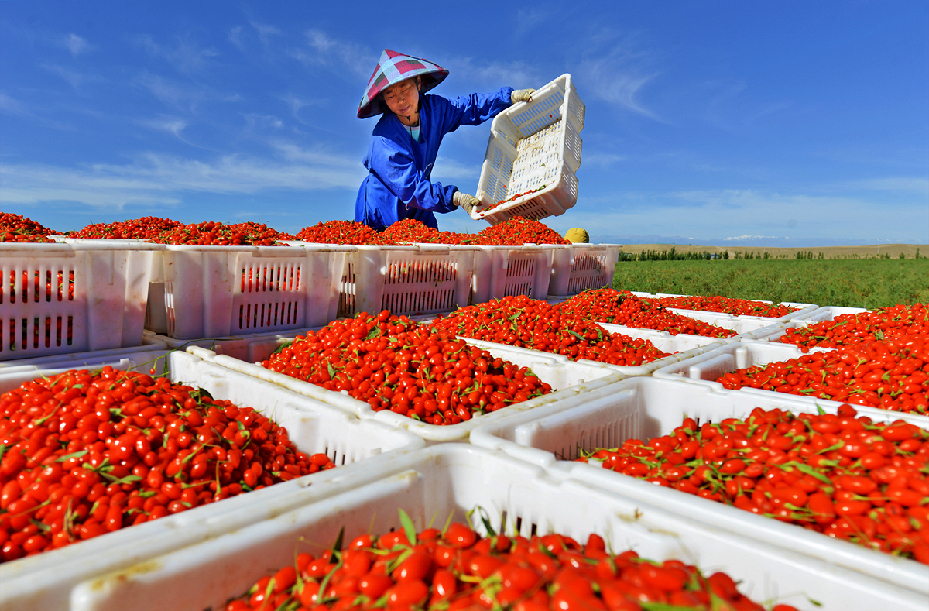 ????2020年7月19日,在甘肅省張掖市高臺(tái)縣黑泉鎮(zhèn)十壩村戈壁灘上,農(nóng)民正在將采摘成框的枸杞裝車。鄭耀德 攝
