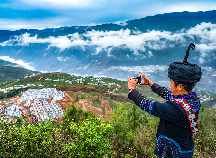 ????四川涼山彝族自治州金陽縣馬依足鎮(zhèn)“千戶彝寨”東山易地移民社區(qū),占地300余畝,2020年8月完工,已完成安置易地搬遷戶1600多戶。圖為易地搬遷居民在看望即將搬入的新居時(shí),用手機(jī)記錄下美麗的新家園。 楊黎明 攝
