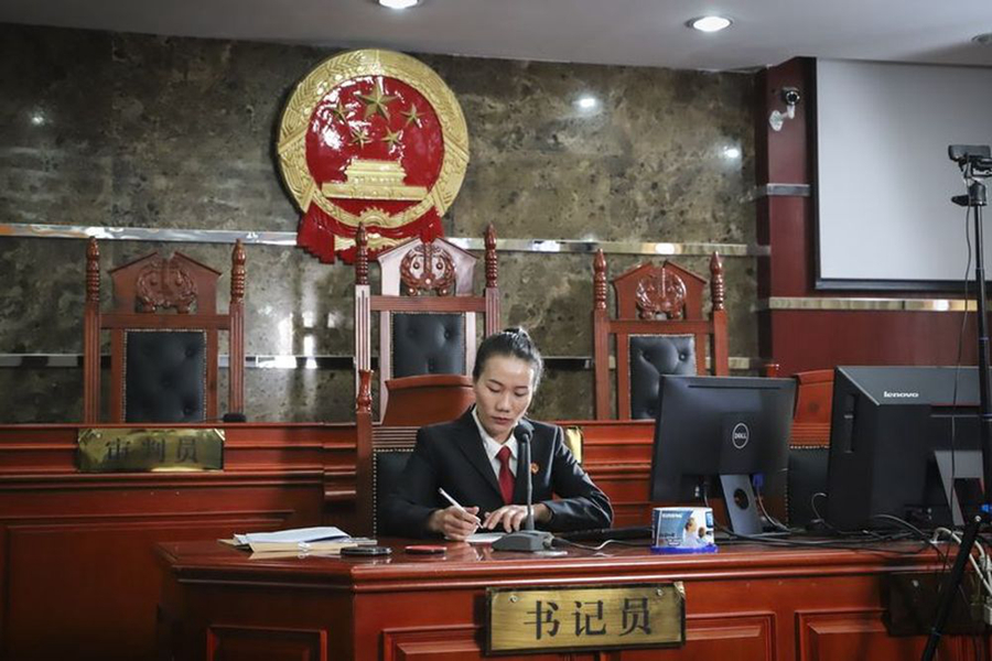 李金蓮在迪慶州中級(jí)人民法院法庭上準(zhǔn)備開庭工作(5月7日攝)。新華社發(fā)(肖竹尹攝)