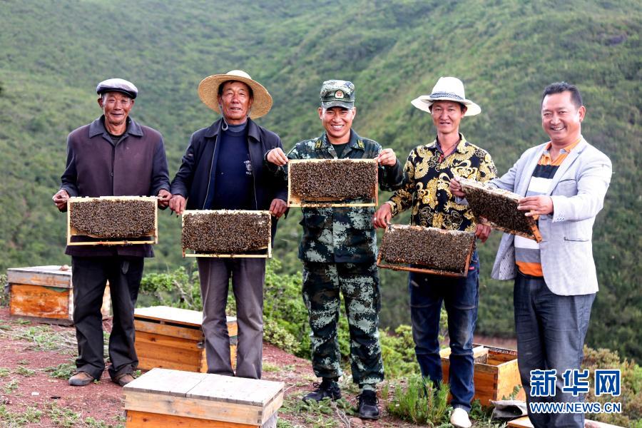 武警四川總隊涼山支隊精準幫扶昭覺縣梭梭拉打村發(fā)展養(yǎng)蜂產(chǎn)業(yè),總隊駐村扶貧干部布哈(中)和村民一同展示豐收成果(2019年6月12日攝)。新華社發(fā)(楊劍 攝)