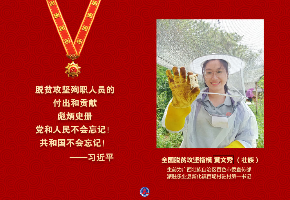 黃文秀同志把青春和熱血都獻給了脫貧攻堅事業(yè),以實際行動詮釋了共產黨人的初心和使命,用短暫而精彩的人生譜寫了一曲新時代共產黨員的奉獻之歌。2019年6月17日犧牲在脫貧攻堅一線,年僅30歲。