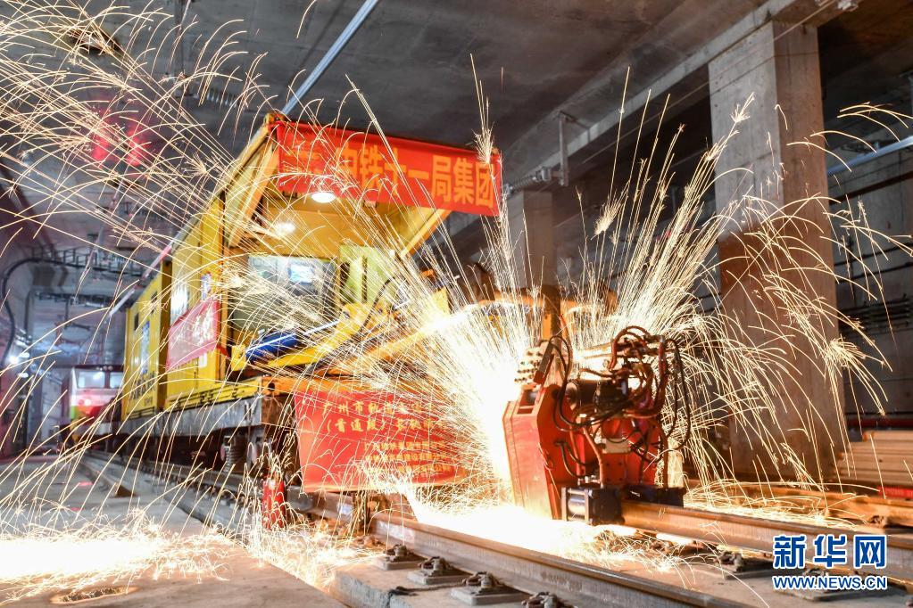 中鐵十一局軌道焊機(jī)在焊接廣州地鐵18號(hào)線首通段最后一個(gè)鋼軌接頭(2021年4月20日攝)。新華社記者 劉大偉 攝