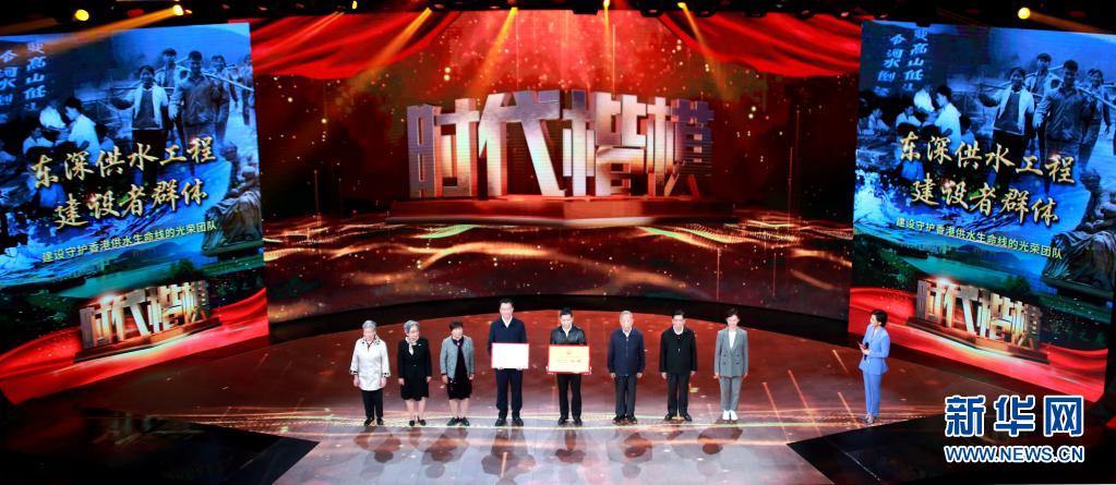 東深供水工程建設(shè)者群體代表在“時(shí)代楷模”發(fā)布儀式上領(lǐng)取“時(shí)代楷?!豹?jiǎng)牌和證書(2021年4月18日攝)。新華社記者 潘旭 攝