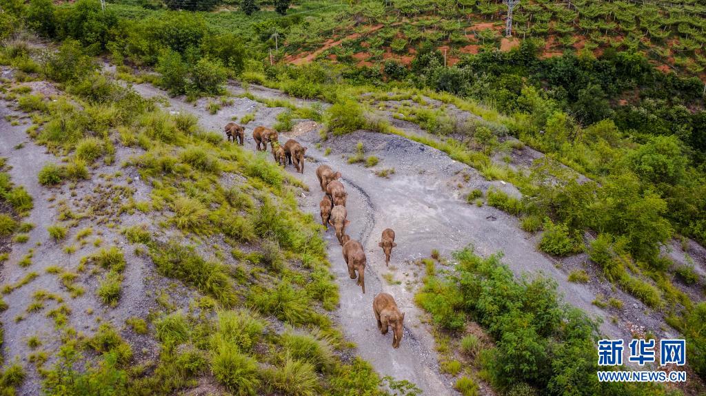 這是5月28日在云南省玉溪市峨山縣境內(nèi)拍攝的象群(無人機照片)。新華社記者 胡超 攝