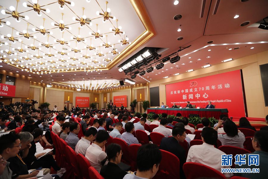 9月24日,慶祝中華人民共和國成立70周年活動(dòng)新聞中心在北京梅地亞中心二層新聞發(fā)布廳舉辦第一場新聞發(fā)布會(huì)。圖為新聞發(fā)布會(huì)現(xiàn)場。新華網(wǎng)記者 陳競超 攝