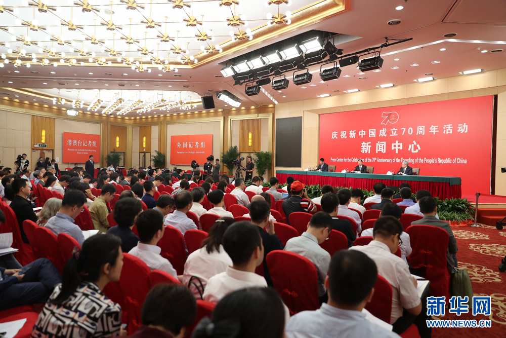 9月27日,慶祝中華人民共和國成立70周年活動(dòng)新聞中心在梅地亞中心二層新聞發(fā)布廳舉辦第三場(chǎng)新聞發(fā)布會(huì),中央農(nóng)村工作領(lǐng)導(dǎo)小組辦公室主任、農(nóng)業(yè)農(nóng)村部部長(zhǎng)韓長(zhǎng)賦,國務(wù)院扶貧開發(fā)領(lǐng)導(dǎo)小組辦公室主任劉永富介紹全面建成小康社會(huì),扎實(shí)推進(jìn)脫貧攻堅(jiān)和鄉(xiāng)村振興,并回答記者提問。圖為發(fā)布會(huì)現(xiàn)場(chǎng)。新華網(wǎng) 陳杰 攝