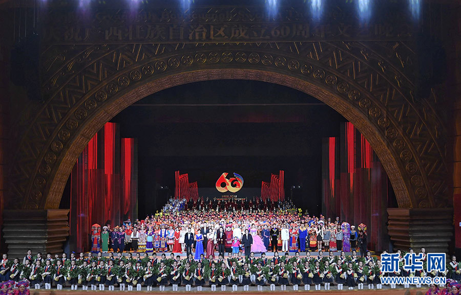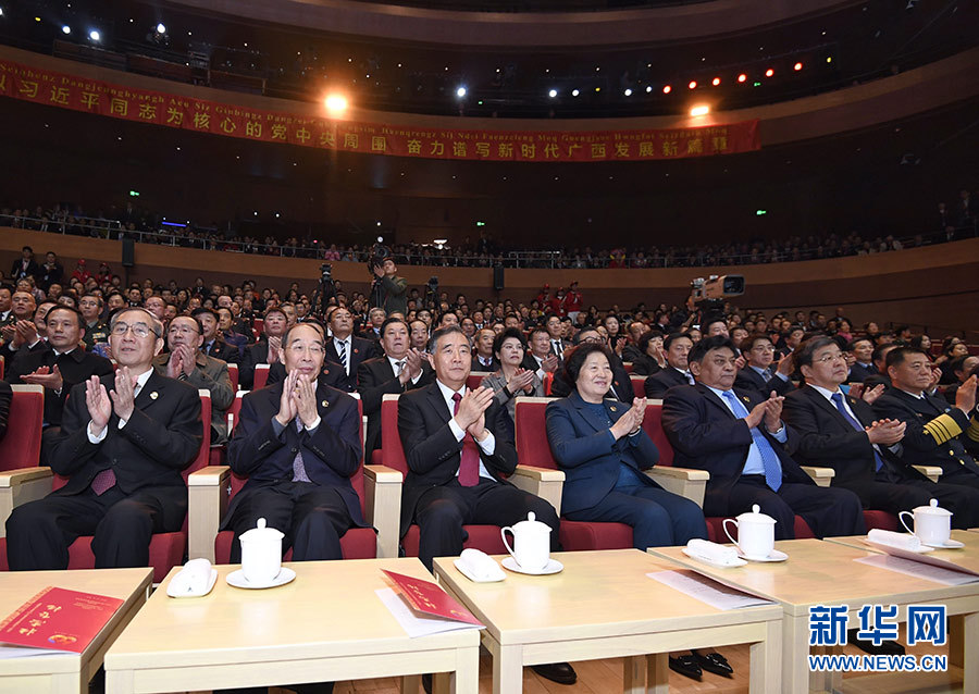 12月9日,慶祝廣西壯族自治區(qū)成立60周年文藝晚會(huì)《壯志飛揚(yáng)》在廣西文化藝術(shù)中心精彩上演。中共中央政治局常委、全國政協(xié)主席、中央代表團(tuán)團(tuán)長汪洋和各族各界干部群眾等近900人觀看演出。 新華社記者 申宏 攝