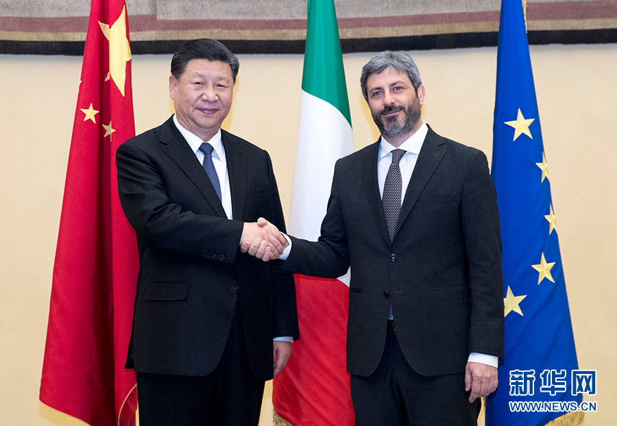 3月22日,國(guó)家主席習(xí)近平在羅馬會(huì)見(jiàn)意大利眾議長(zhǎng)菲科。新華社記者 王曄 攝