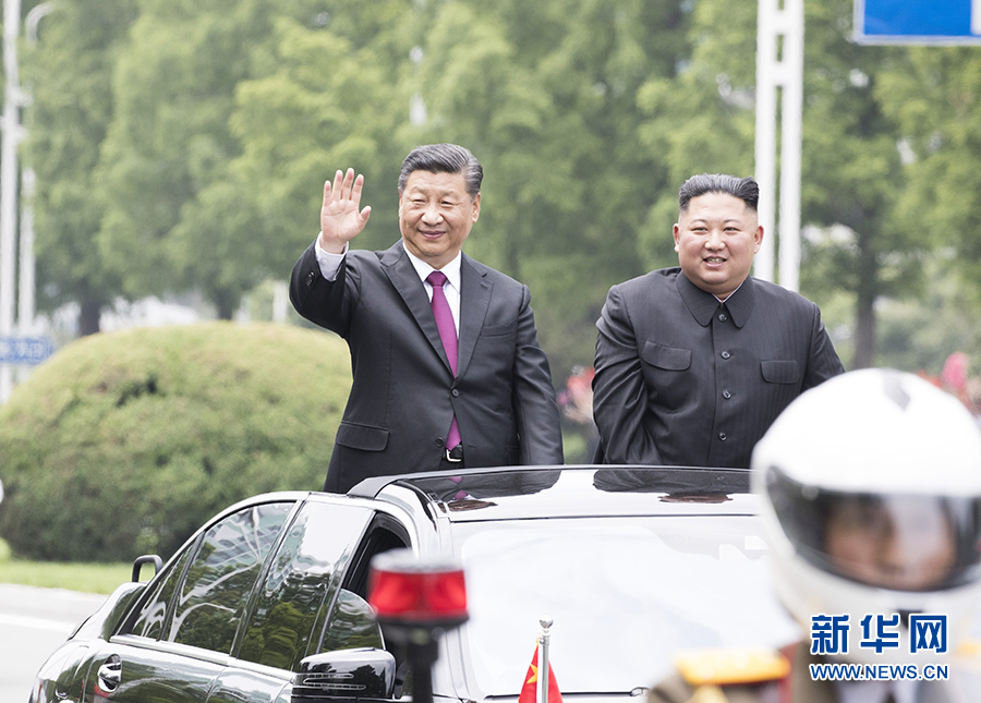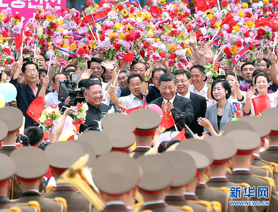 習近平抵達黎明大街路口,換乘敞篷車,與金正恩同車前往錦繡山太陽宮廣場。街道兩旁,人山人海,盛況空前。歡迎民眾站在高坡上,從住宅樓的窗臺上,向中國貴賓歡呼致敬。到處都是熱情的笑臉,友好的歡呼聲不絕于耳。習近平和金正恩向歡迎的人群頻頻揮手致意。