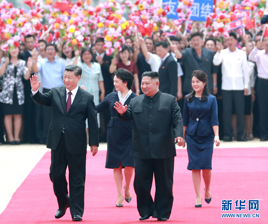 當?shù)貢r間12時許,習近平乘坐的專機抵達平壤順安機場。雨后初晴的平壤,天高云淡、氣候怡人,到處郁郁蔥蔥、繁花似錦,整個城市洋溢著友好熱烈的氣氛。機場上中朝兩國國旗迎風飄揚,“熱烈歡迎中國共產(chǎn)黨中央委員會總書記、中華人民共和國主席習近平同志”“鮮血凝成的朝中兩國人民之間牢不可破的友誼團結(jié)萬歲”大幅標語高高懸掛,近萬名群眾排列成整齊的隊伍,有力地揮動著花束,以歡快的口號和熱情的笑容,歡迎尊貴的中國客人到來。朝鮮勞動黨委員長、國務委員會委員長金正恩和夫人李雪主到機場迎接。