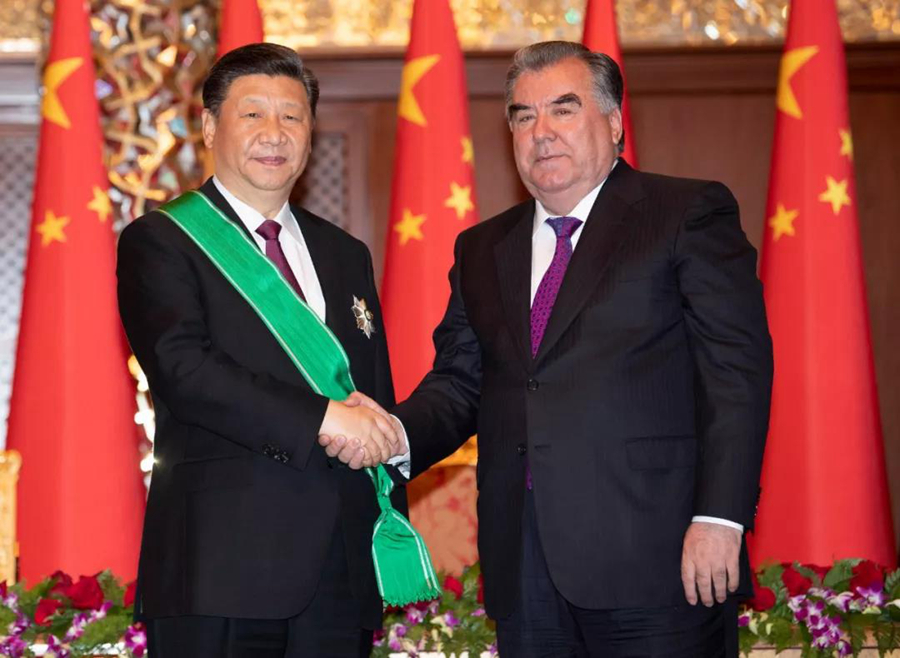 ↑熱恩別科夫總統(tǒng)和拉赫蒙總統(tǒng)分別向習(xí)主席授予各自國(guó)家最高獎(jiǎng)?wù)?,感謝習(xí)主席為發(fā)展吉中、塔中友誼所作的卓越貢獻(xiàn)。照片分別由新華社記者謝環(huán)馳、沙達(dá)提攝