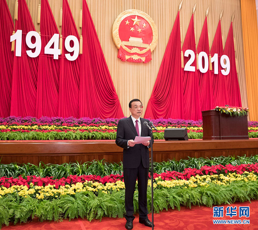 9月30日晚,慶祝中華人民共和國成立70周年招待會在北京人民大會堂隆重舉行。中共中央政治局常委、國務(wù)院總理李克強主持招待會。 新華社記者 黃敬文 攝