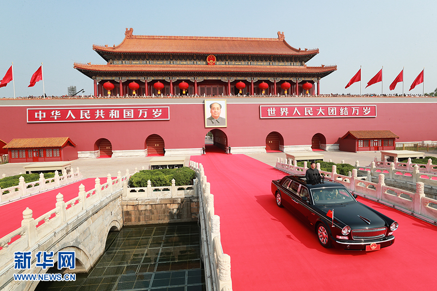 10月1日,慶祝中華人民共和國成立70周年大會在北京天安門廣場隆重舉行。中共中央總書記、國家主席、中央軍委主席習(xí)近平發(fā)表重要講話并檢閱受閱部隊(duì)。這是習(xí)近平乘坐檢閱車,經(jīng)過金水橋,駛上長安街。 新華社記者 燕雁 攝