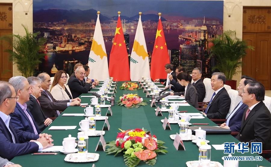 11月8日,全國政協(xié)主席汪洋在北京人民大會(huì)堂會(huì)見塞浦路斯議長西盧里斯?!⌒氯A社記者 鞠鵬 攝
