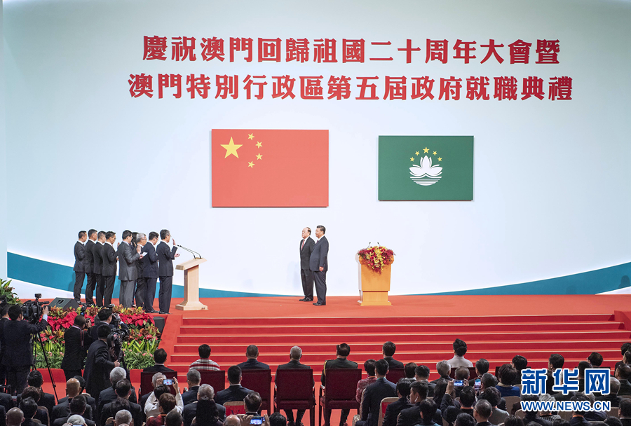 12月20日,慶祝澳門回歸祖國20周年大會暨澳門特別行政區(qū)第五屆政府就職典禮在澳門東亞運動會體育館隆重舉行。中共中央總書記、國家主席、中央軍委主席習近平出席并發(fā)表重要講話。由習近平監(jiān)誓,澳門特別行政區(qū)第五屆政府主要官員在澳門特區(qū)第五任行政長官賀一誠帶領下宣誓就職。 新華社記者 李濤 攝