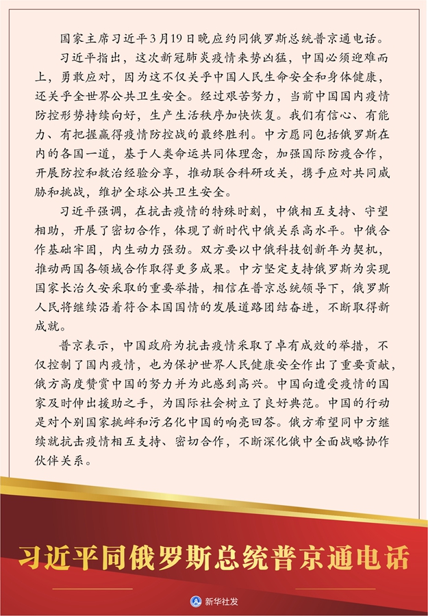 習(xí)近平指出,這次新冠肺炎疫情來(lái)勢(shì)兇猛,中國(guó)必須迎難而上,勇敢應(yīng)對(duì),因?yàn)檫@不僅關(guān)乎中國(guó)人民生命安全和身體健康,還關(guān)乎全世界公共衛(wèi)生安全。經(jīng)過(guò)艱苦努力,當(dāng)前中國(guó)國(guó)內(nèi)疫情防控形勢(shì)持續(xù)向好,生產(chǎn)生活秩序加快恢復(fù)。我們有信心、有能力、有把握贏得疫情防控戰(zhàn)的最終勝利。中方愿同包括俄羅斯在內(nèi)的各國(guó)一道,基于人類(lèi)命運(yùn)共同體理念,加強(qiáng)國(guó)際防疫合作,開(kāi)展防控和救治經(jīng)驗(yàn)分享,推動(dòng)聯(lián)合科研攻關(guān),攜手應(yīng)對(duì)共同威脅和挑戰(zhàn),維護(hù)全球公共衛(wèi)生安全。