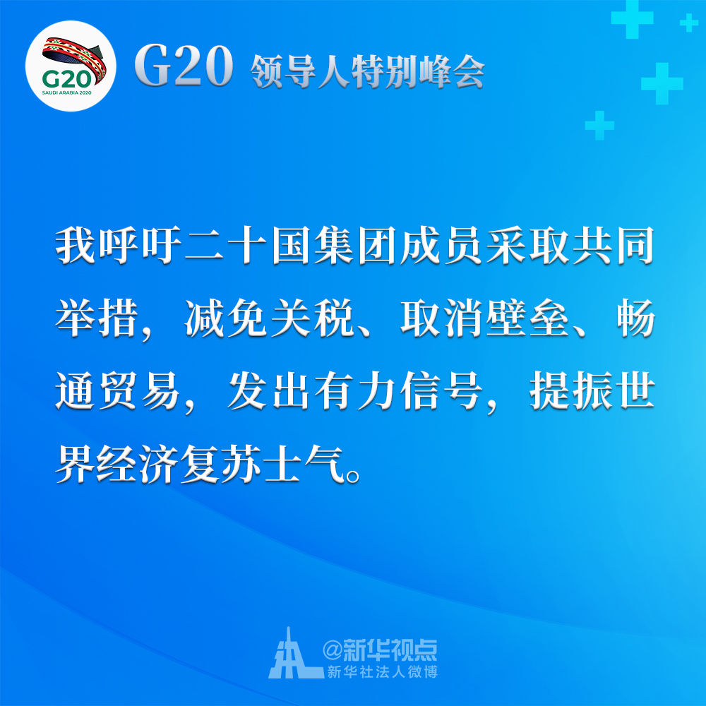 我呼吁二十國集團(tuán)成員采取共同舉措,減免關(guān)稅、取消壁壘、暢通貿(mào)易,發(fā)出有力信號,提振世界經(jīng)濟(jì)復(fù)蘇士氣。我們應(yīng)該制定二十國集團(tuán)行動計劃,并就抗疫宏觀政策協(xié)調(diào)及時作出必要的機(jī)制性溝通和安排。