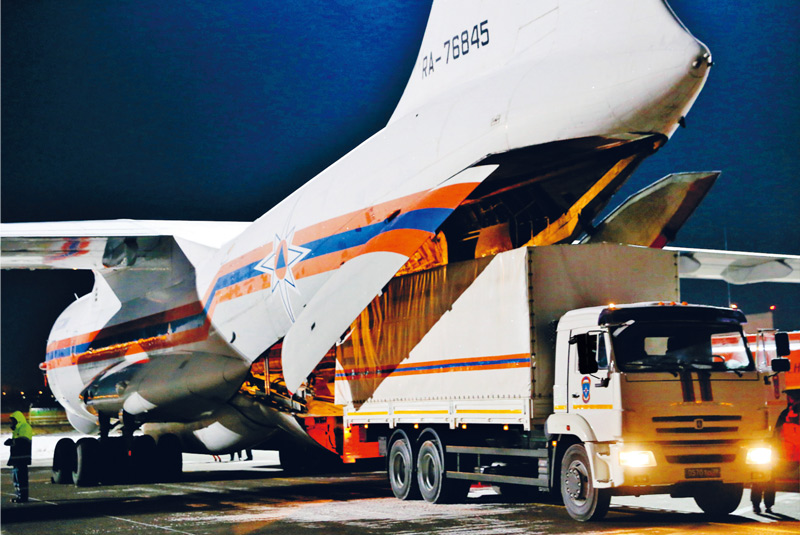 2020年2月8日,在俄羅斯莫斯科附近的茹科夫斯基機(jī)場,工作人員將俄羅斯政府向中方提供的醫(yī)療援助物資裝上運輸機(jī)。 新華社/衛(wèi)星社