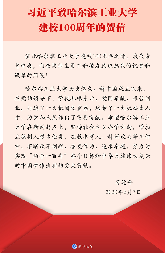 新華社北京6月7日電 中共中央總書記、國家主席、中央軍委主席習(xí)近平7日致信祝賀哈爾濱工業(yè)大學(xué)建校100周年,向全校師生員工和校友致以熱烈的祝賀和誠摯的問候。