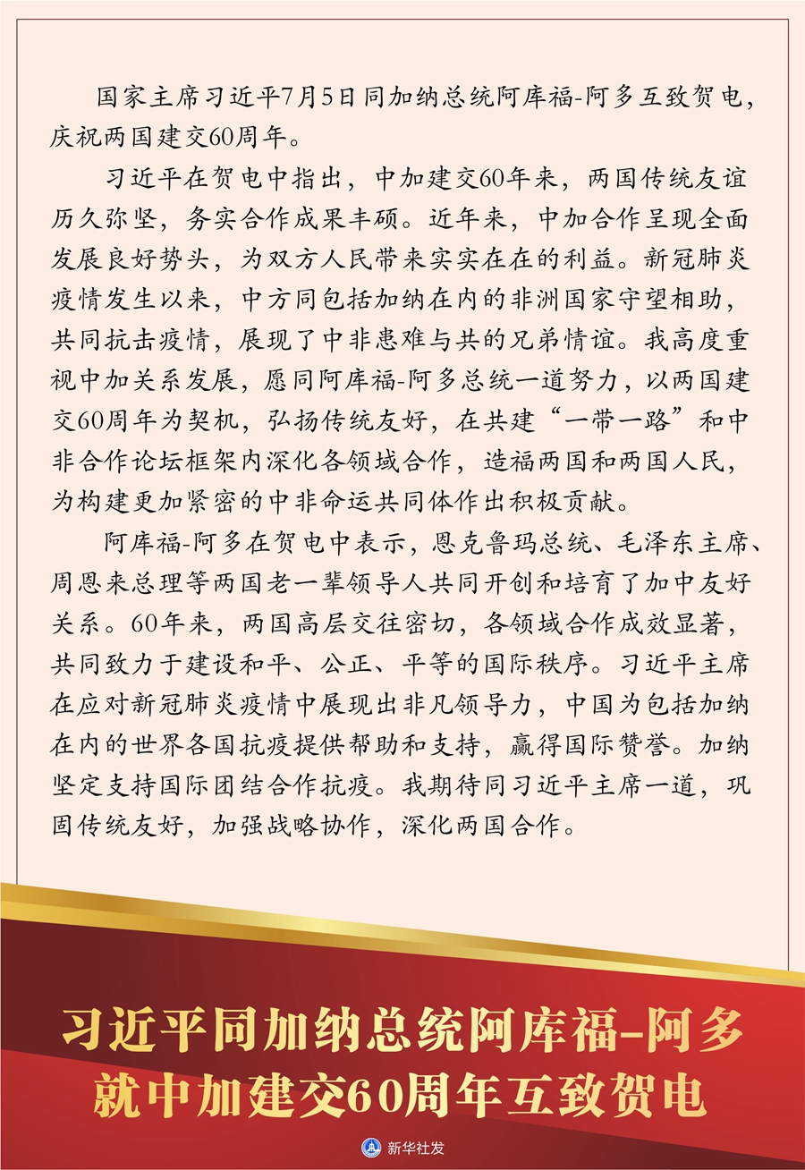 新華社北京7月5日電? 國家主席習(xí)近平7月5日同加納總統(tǒng)阿庫福-阿多互致賀電,慶祝兩國建交60周年。