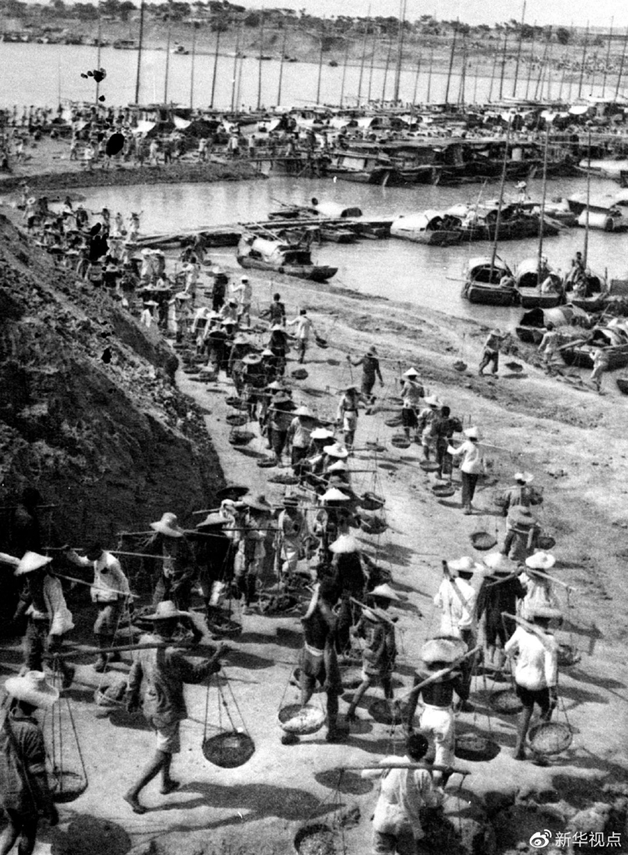民工在安徽潤(rùn)河集蓄洪分水閘工地施工(1951年攝,資料照片)。
