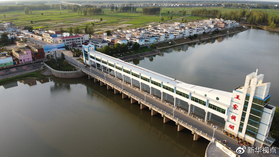 這是2020年8月15日拍攝的位于安徽省阜南縣的王家壩閘(無(wú)人機(jī)照片)。新華社記者 張端 攝