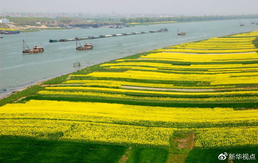 2008年3月27日,一支運(yùn)煤船隊(duì)通過(guò)岸邊開滿油菜花的淮河淮南段。金黃色的油菜花和綠油油的麥苗使得淮河岸邊美景如畫。新華社發(fā)(陳彬攝)