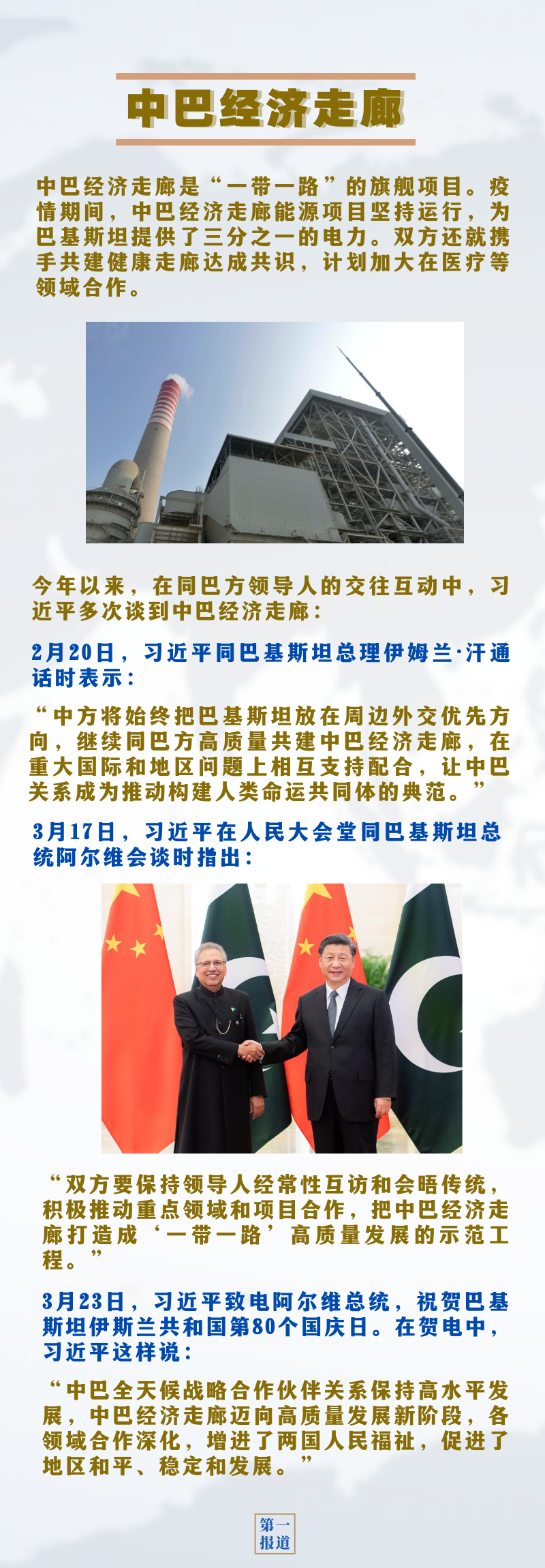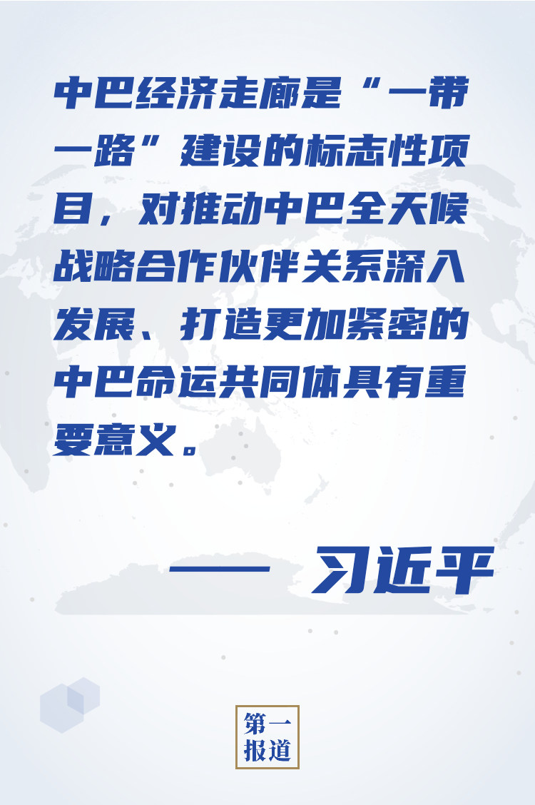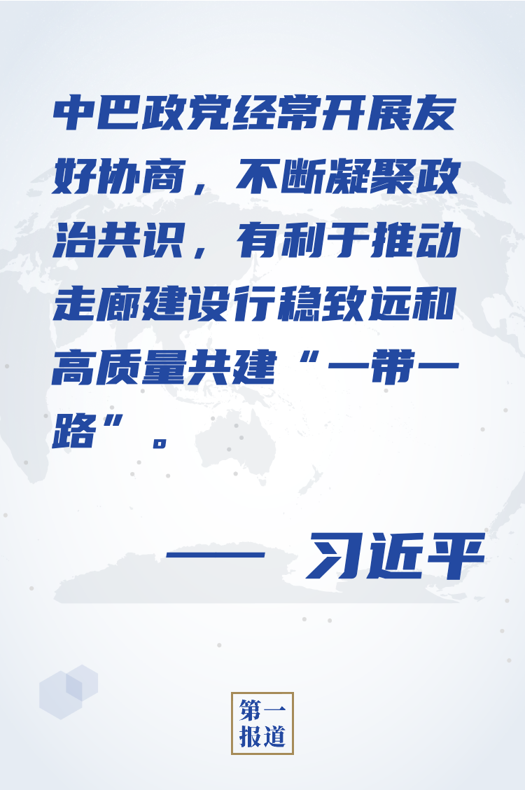 習(xí)近平指出,中巴是有著特殊友好情誼的好兄弟、好伙伴。中巴經(jīng)濟(jì)走廊是“一帶一路”建設(shè)的標(biāo)志性項(xiàng)目,對推動中巴全天候戰(zhàn)略合作伙伴關(guān)系深入發(fā)展、打造更加緊密的中巴命運(yùn)共同體具有重要意義。中巴政黨經(jīng)常開展友好協(xié)商,不斷凝聚政治共識,有利于推動走廊建設(shè)行穩(wěn)致遠(yuǎn)和高質(zhì)量共建“一帶一路”。