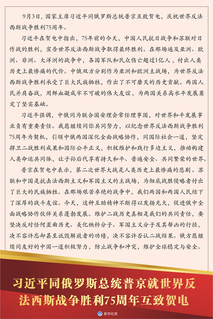 新華社北京9月3日電 國(guó)家主席習(xí)近平3日同俄羅斯總統(tǒng)普京互致賀電,慶祝世界反法西斯戰(zhàn)爭(zhēng)勝利75周年。