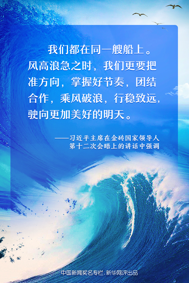 金磚國(guó)家領(lǐng)導(dǎo)人第十二次會(huì)晤17日晚以視頻方式舉行。習(xí)近平主席發(fā)表題為《守望相助共克疫情 攜手同心推進(jìn)合作》的重要講話(huà)時(shí)強(qiáng)調(diào),我們都在同一艘船上。風(fēng)高浪急之時(shí),我們更要把準(zhǔn)方向,掌握好節(jié)奏,團(tuán)結(jié)合作,乘風(fēng)破浪,行穩(wěn)致遠(yuǎn),駛向更加美好的明天。