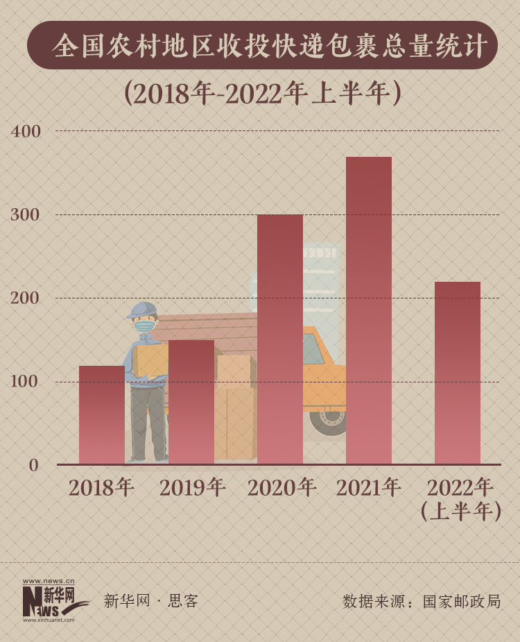 从上图可以看出,2018年-2021年,全国农村地区快递包裹收投总量在逐年上升,由2018年的120亿件上升到2021年的370亿件。庞大的快递包裹数据背后,是加速推进的“快递进村”步伐和不断增强的农村经济活力,也让人看到了农村消费市场蕴藏的巨大潜力。