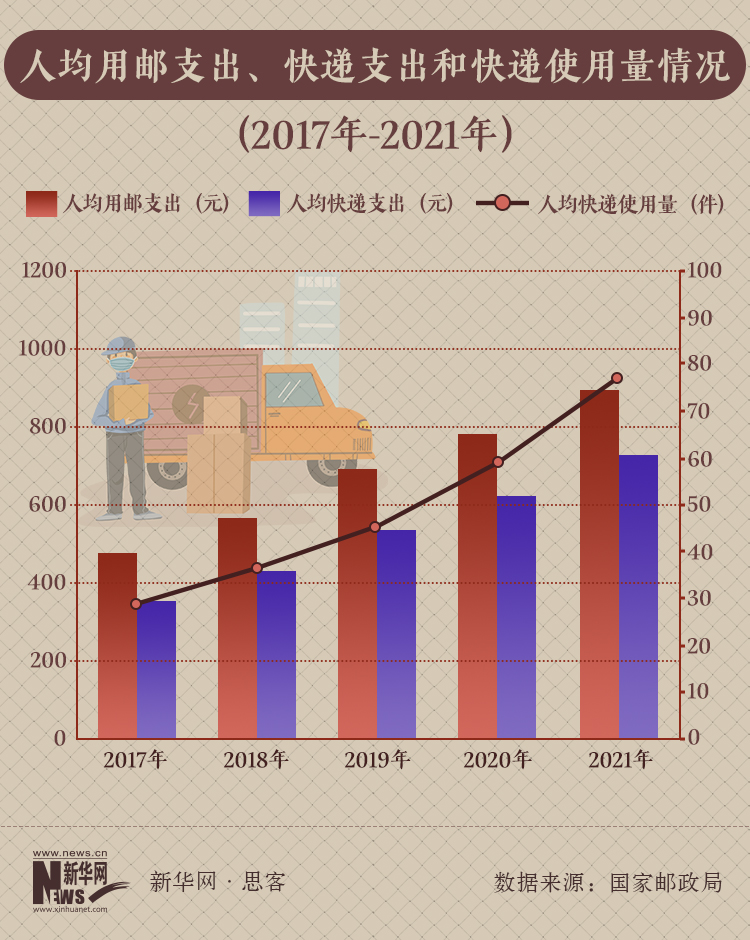 据国家邮政局数据显示,2017-2021年人均用邮支出、快递支出和快递使用量每年都在增长,其中2021年人均快递使用量为76.7件,年人均用邮支出895.0元,年人均快递支出731.4元。按照第七次全国人口普查结果14.12亿人推测,2021年平均每人每月快递量超过6个。