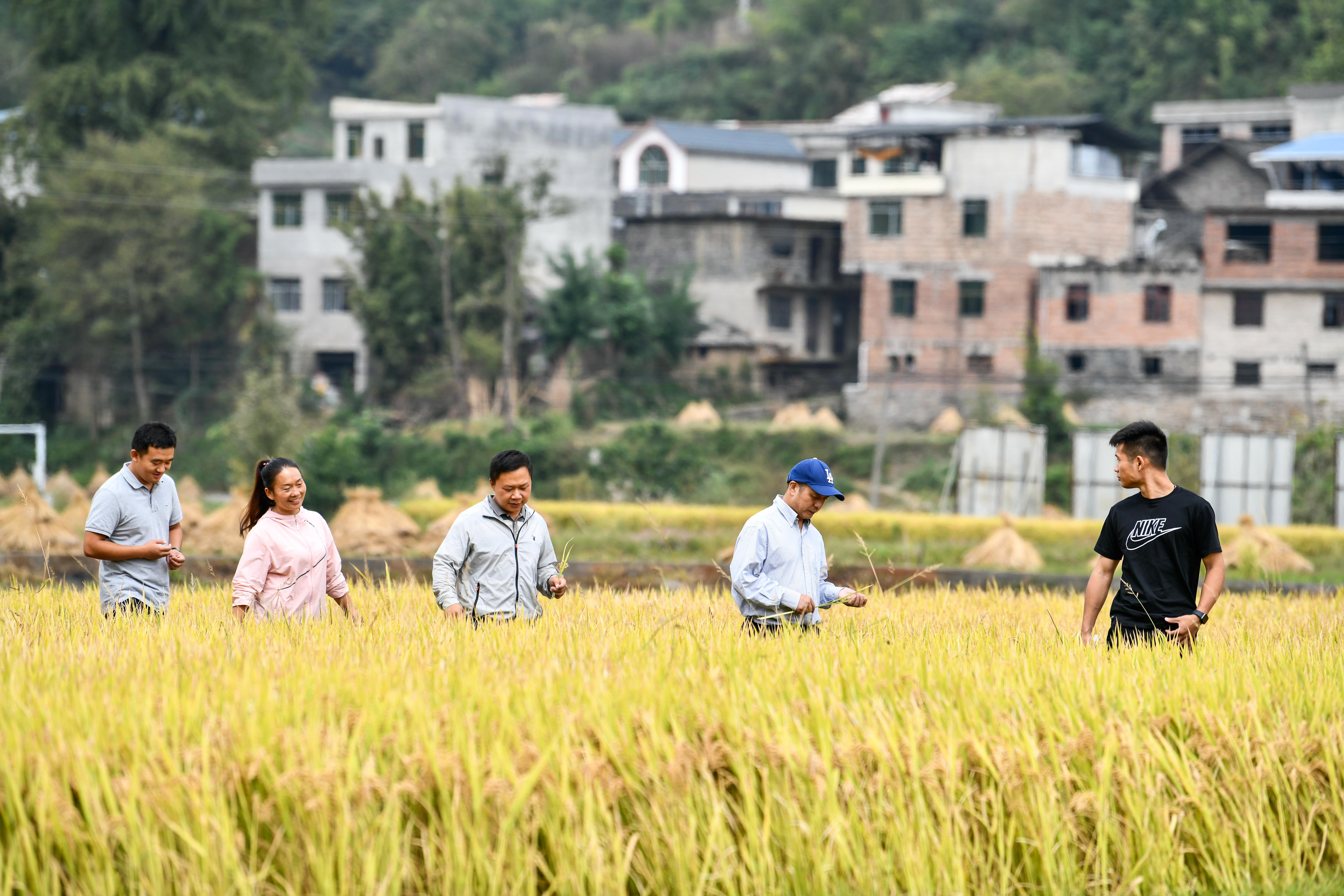 ▲在贵州省麻江县坝芒乡乐坪村,新农人和农业专家及随行学生走在金黄的稻田里。新华社记者 杨文斌 摄