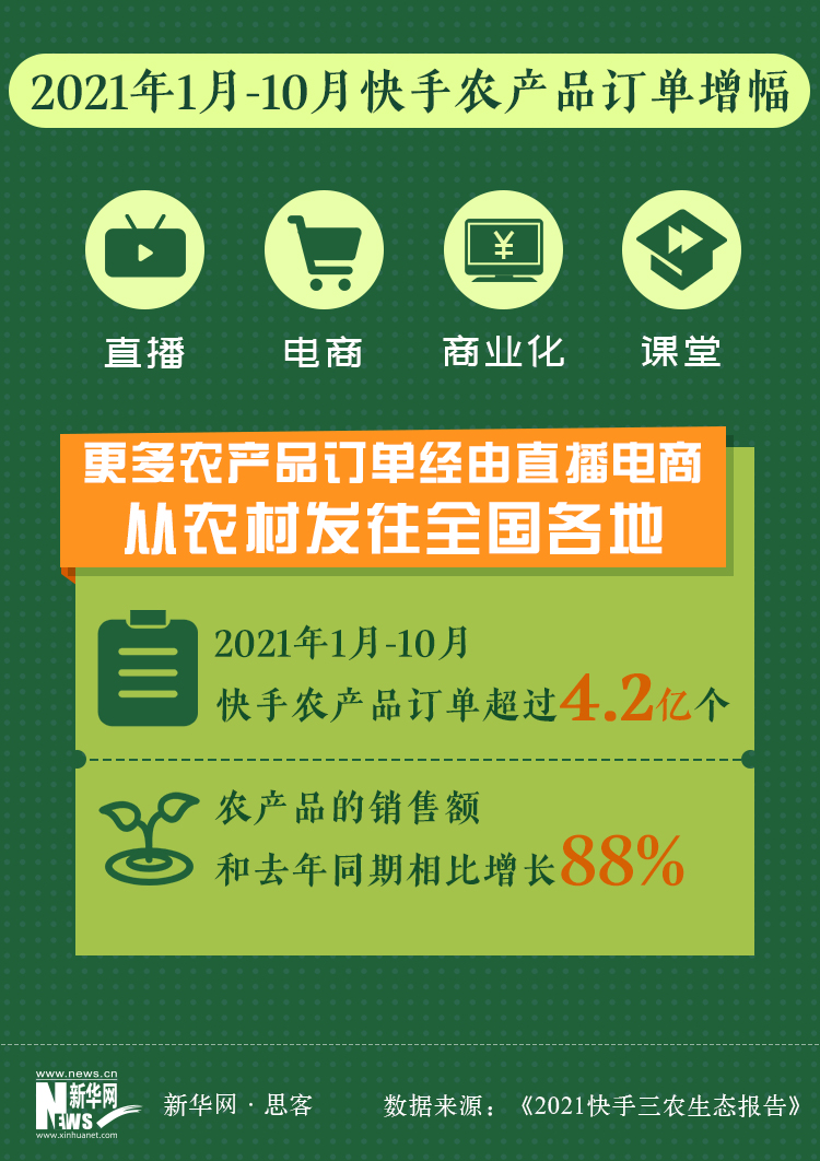 快手平台发布的《2021快手三农生态报告》指出,借助短视频和直播带货模式,越来越多的特色农产品走向全国,不仅给当地农民带来了丰厚的收入,也拉动了农村经济,实现了农产品畅销和乡村规模经济的共同发展。