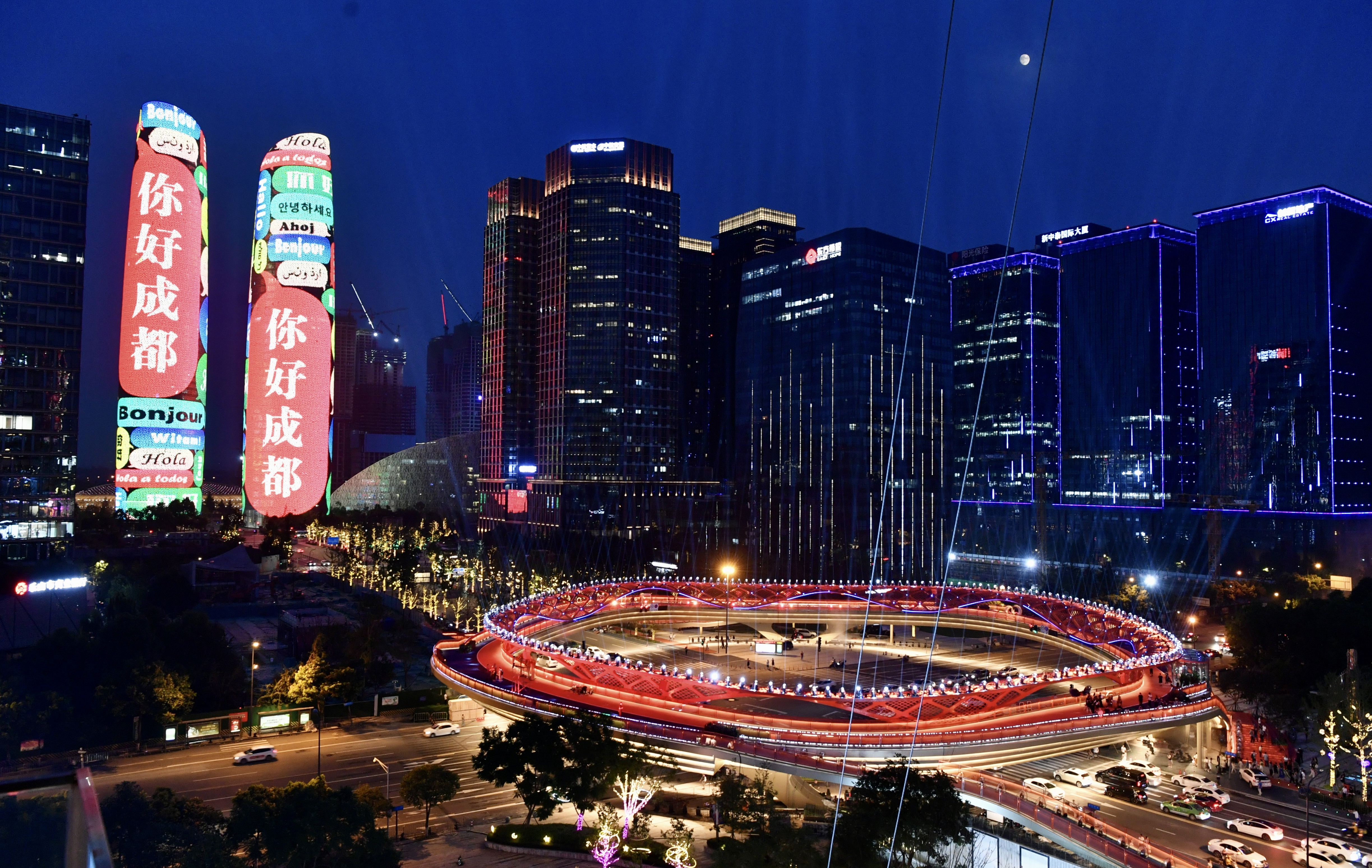成都交子公园商圈的交子大道上,绚丽斑斓的景观桥梁“交子之环”与天府双塔交相辉映。新华社发(成都市高新区宣传部供图)