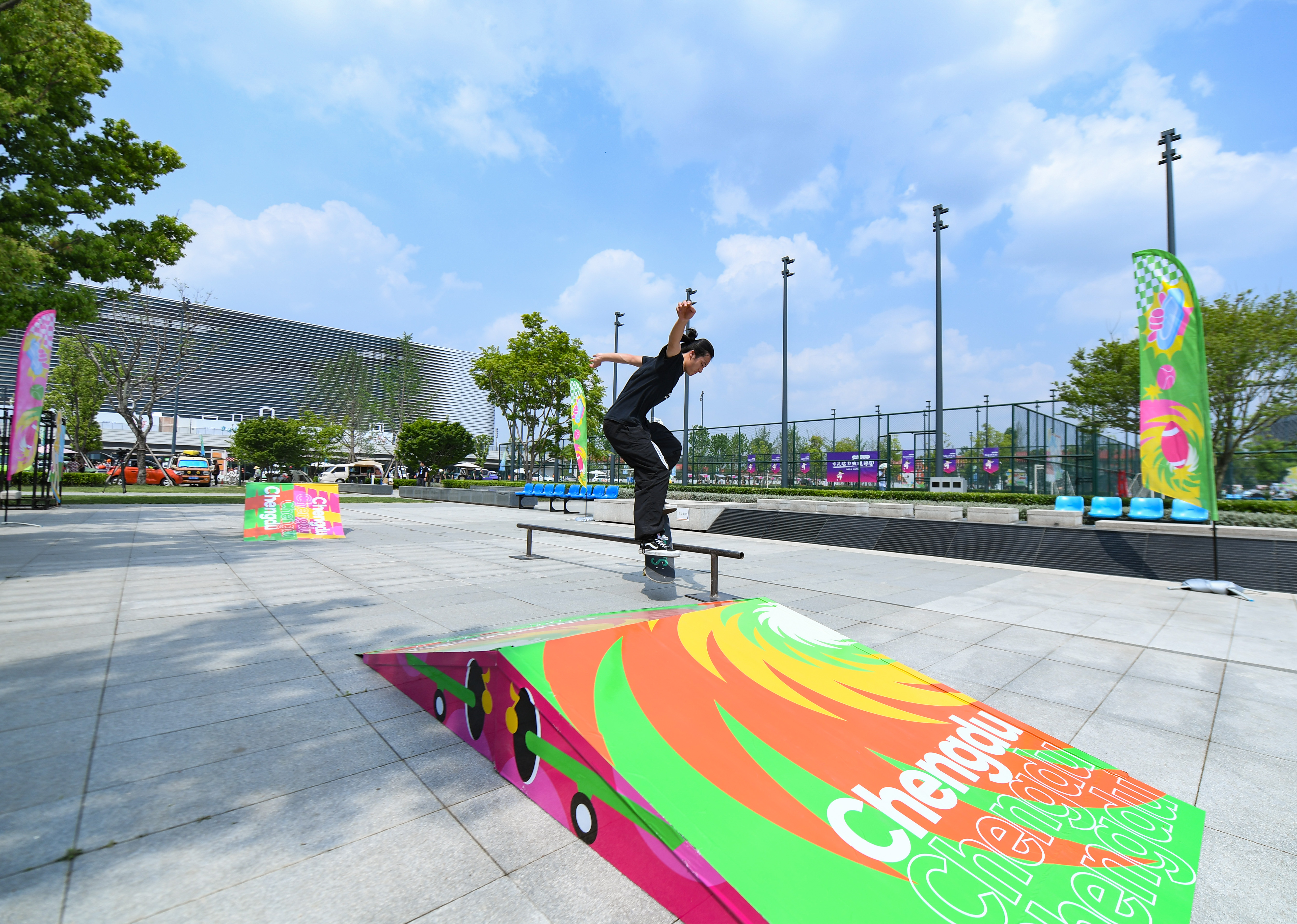 4月19日,在成都东安湖体育公园,体育爱好者在 “潮流运动会”上练习滑板。新华社记者 王曦 摄