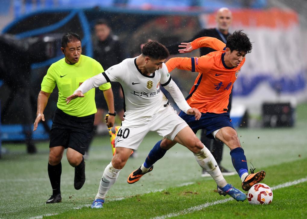 10月17日,上海海港队球员吾米提江·玉苏普(前左)在比赛中与青岛海牛队球员买乌郎·米吉提拼抢。当日,在山东青岛举行的2025赛季中超联赛第27轮比赛中,上海海港队客场4:3战胜青岛海牛队。新华社记者 李紫恒 摄
