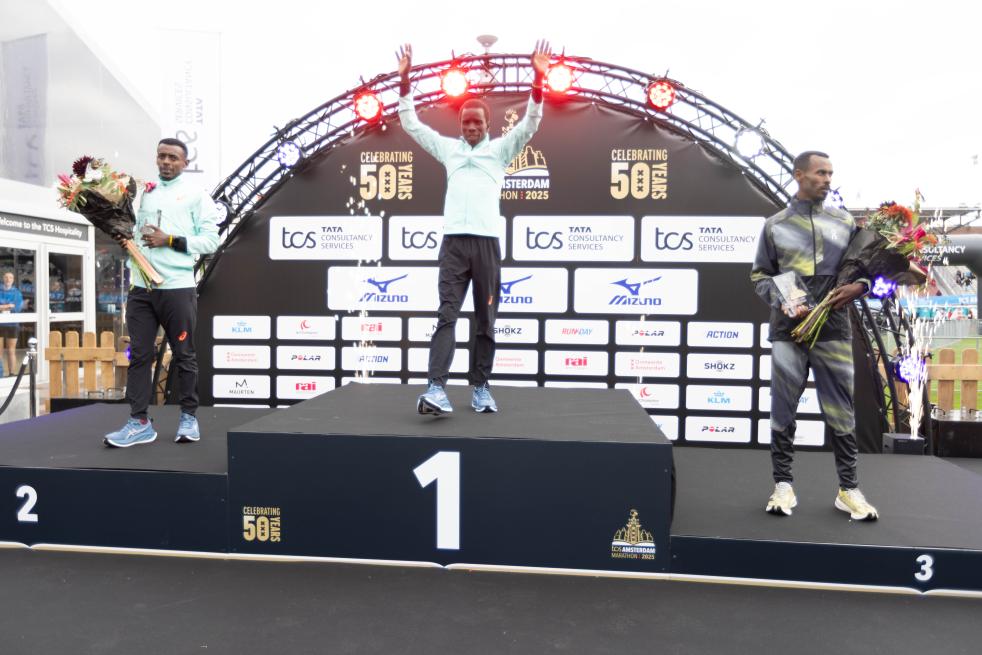 10月19日,肯尼亚选手基普春巴(中)在荷兰阿姆斯特丹举行的第50届阿姆斯特丹马拉松赛男子组颁奖仪式上。新华社发(西尔维娅·莱德雷尔摄)