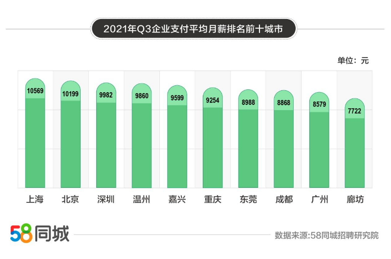 全国平均招聘月薪同比上升13.43%,上海平均月薪为10569元