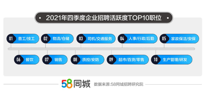 根据58同城招聘研究院数据,2021年四季度,成渝地区企业招聘需求位列前茅;武汉、长沙企业的招聘需求大量释放,长沙较疫情前的2019年增长33.40%。从职位上看,企业招聘活跃度TOP10的职位分别为:普工/技工、物流/仓储、司机/交通服务、人事/行政/后勤、家政保洁/安保、餐饮、销售、质控/安防、超市/百货/零售、生产管理/研发。