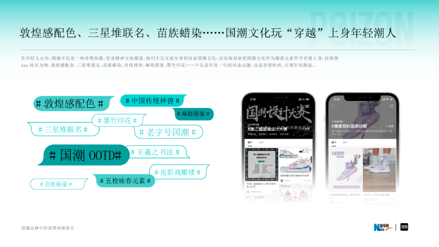 年轻一代作为当下国潮消费主力,正激发国潮创新的潜力;此外,重视精神价值、分享表达的年轻人,还与国潮品牌进行深度共创,让品牌背后寄托的传统文化在年轻人中传承。《报告》以得物App社区为例,敦煌感配色、三星堆联名、苗族蜡染、传统神兽、麻将图案、墨竹印花、中国锦鲤等国潮文化符号,不仅是年轻人的讨论话题,还是他们的穿搭时尚,让国潮不仅是一种消费热潮,更是精神文化潮流。