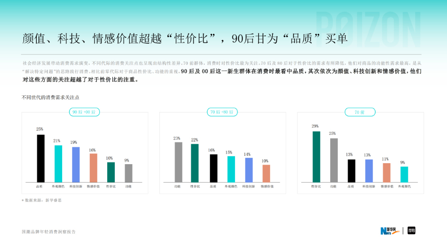 据悉,报告以年轻消费者最为聚集的“得物App”为研究样本,通过国潮行业透视、品牌案例剖析、年轻消费趋势等三大维度,新时尚、新文化、新科技、新生活、新过节等五大场景进行数据发布和分析。报告显示,90后及00后在消费时最看中品质,同时关注颜值、科技创新和情感价值,甚至超越 “性价比”。年轻人需求的结构性新变化,为国潮品牌开辟“新供给”,也为更多国潮品牌打开创新思路。