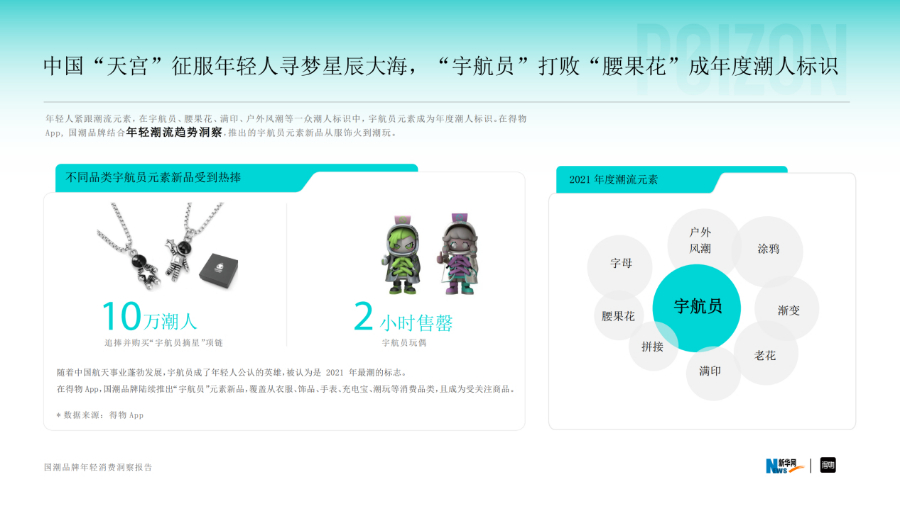 报告显示,国潮品牌新品已覆盖鞋履、服装、数码、箱包、手表、美妆、配饰甚至艺术品,满足年轻人的全面消费需求,受到年轻人喜爱。例如,随着中国人首次进入自己的空间站,年轻人因为中国航天技术的突破,有超过10万人扎堆得物App购买某国潮品牌首发的“宇航员”元素新品项链,“宇航员”限量玩偶首发2小时内即售罄。随着全民运动健身掀起热潮,某国潮运动品牌结合年轻趋势洞察,在得物App独家发布的新品“男女通吃”,在男性主流人群基础上,收获大批女性新用户。