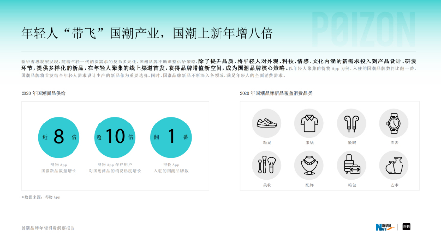 新华睿思观察发现,年轻一代在品质、外观、科技、情感、文化内涵五大方面呈现新需求,多元的需求结构给国潮品牌带来机会,他们通过设计、研发多样化新品,满足年轻人需求,迅速扩大品牌的年轻用户群,为品牌未来拓展空间。报告以得物App为例,2020年,得物App发售国潮新品数增长近8倍,年轻用户对国潮商品的消费热度增长超过10倍,不少新品一经上线即告售罄。