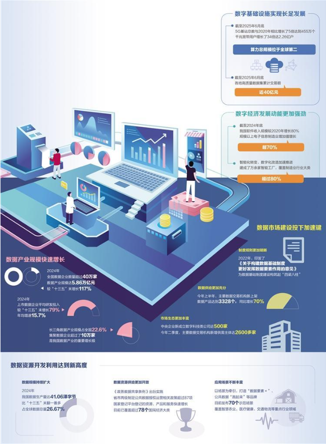 在数字经济快速发展的基础上,数据要素价值加快释放。2024年,全国数据企业数量超过40万家,数据产业规模达5.86万亿元。我国以场景牵引带动数据要素价值充分释放,开展公共数据“跑起来”示范场景建设。一批围绕数据汇聚共享、开发利用的数据企业正在孕育兴起,标准、规范不断推出,数据交易日趋活跃,全国一体化数据市场正在加快构建。