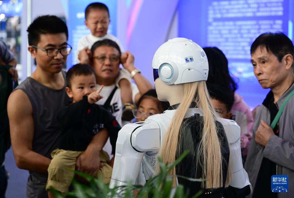 9月21日,小朋友在2025世界制造业大会智能机器人展区和一款机器人互动。