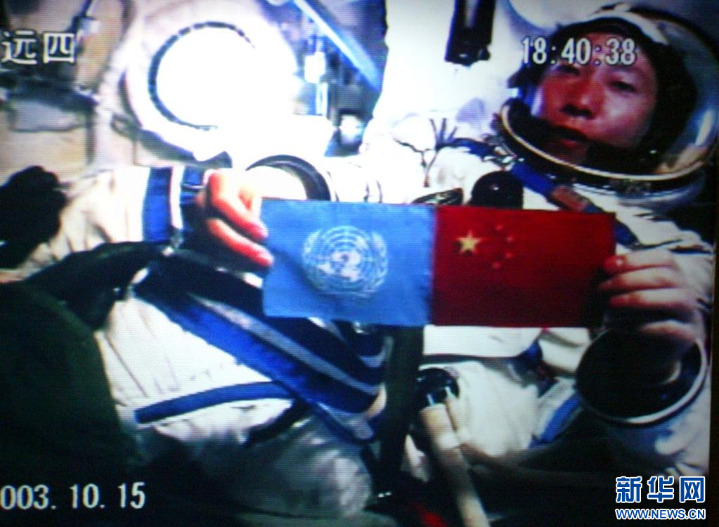 2003年10月15日18时40分,中国第一位航天员杨利伟从太空向世界各国人民问好,并在舱内并列展示了五星红旗和联合国旗(摄于北京航天指挥控制中心大屏幕)。