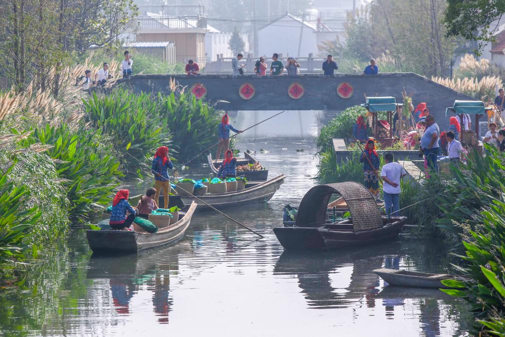 2018年9月23日,在江苏省兴化市东罗村举办的农民丰收节主题活动上,农民在“水上市集”展示特色农产品。新华社发(周社根摄)