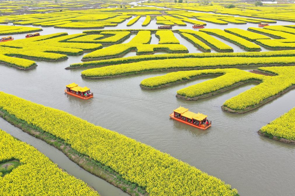 2023年3月29日,游客乘坐画舫欣赏千垛菜花风景区两岸油菜花(无人机照片)。新华社记者毛俊摄