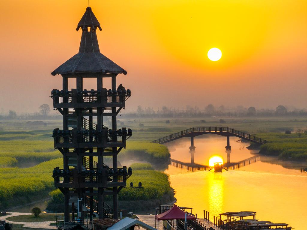 2025年4月8日拍摄的江苏省兴化市千垛景区日出晨景(无人机照片)。新华社发(周社根摄)